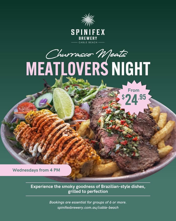 Meatlovers Night Every Wednesday Nothing beats smoky, juicy churrasco meats on a Wednesday. Just saying… you should come. Experience the authentic taste of Brazilian-style dishes, grilled to perfection at Spinifex Cable Beach. Our Churrasco Meats Meatlovers Night takes place every Wednesday from 4pm, with prices starting from just $24.95. It’s the perfect mid-week treat for anyone who loves quality grilled …